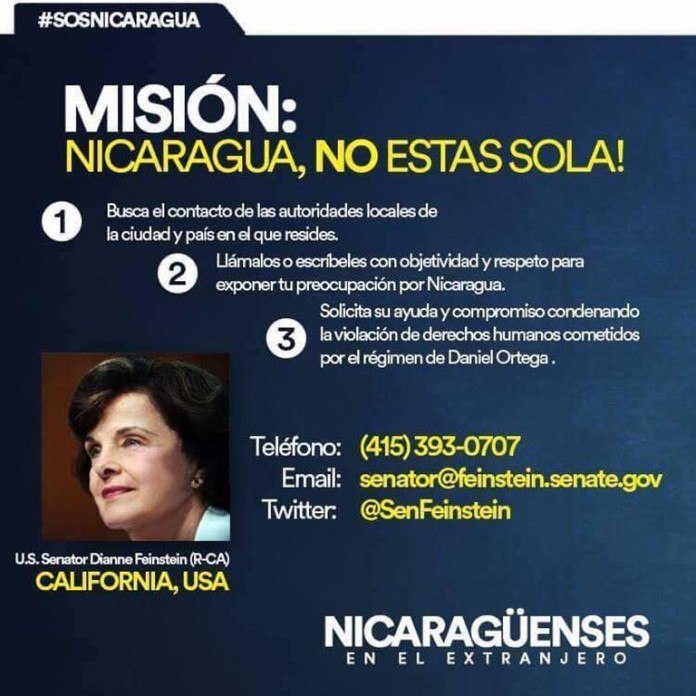 2018ComunitarioEDICIONESEdición #144 MISIÓN: Nicaragua, no estás sola – U.S. Senator Dianne Feinstein (R-CA) June 1, 2018 FacebookTwitterPinterestWhatsAppTelegramEmailPrint COMENTARIOS Escriba sus Comentarios
