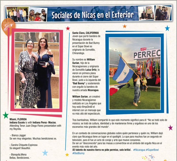 Su nombre es William Surian, hijo de la Nicaragüenses y originaria de Somotillo Luisa Ortiz, lo vieron en primera plana durante el cierre del Súper Bowl, justo a la izquierda del “Bad Bunny” y sosteniendo con orgullo la bandera de nuestra amada Nicaragua.