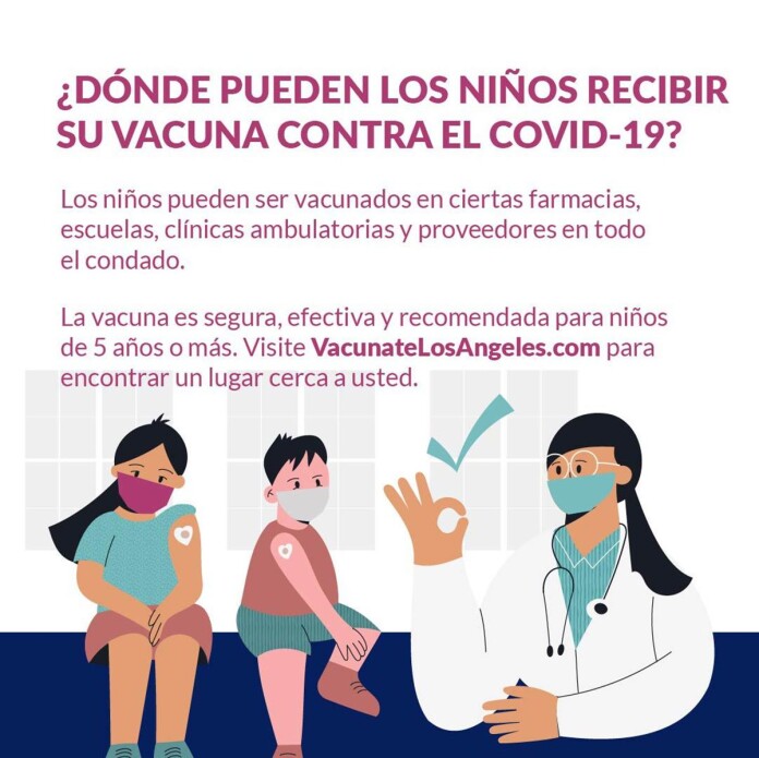 Las vacunas contra el COVID-19 están disponibles para todos los niños en las clínicas de todo el Condado de Los Ángeles, así como en algunas farmacias, escuelas y proveedores de salud. Actualmente, la vacuna es recomendable para todos los niños mayores de 5 años y los refuerzos son recomendables para aquellos mayores de 12 años (Pfizer únicamente).